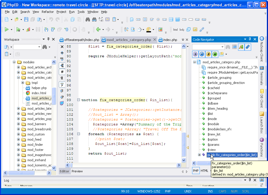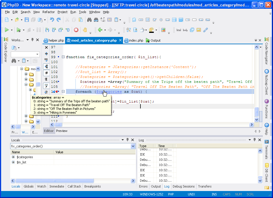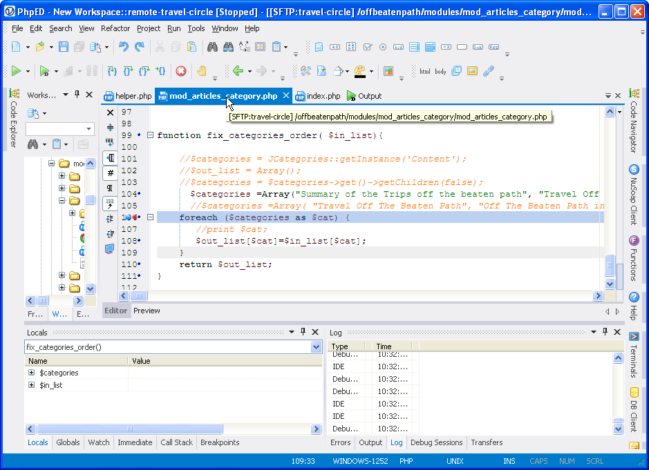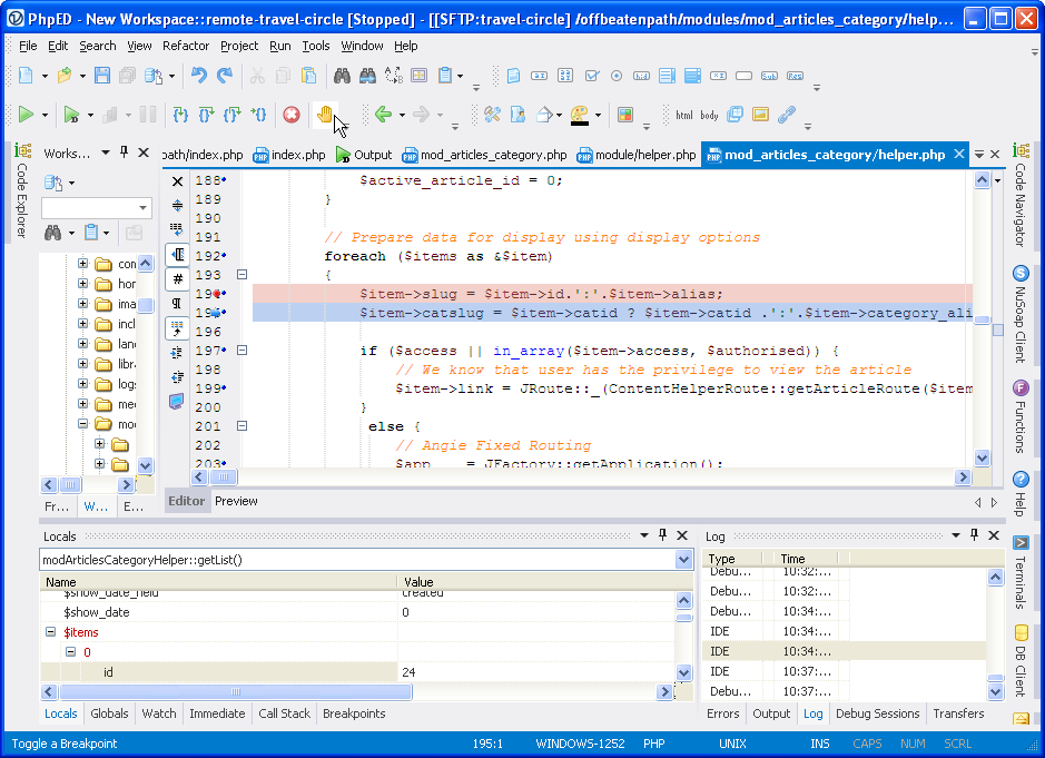 However, it should be noted that while debugging site live is fine – dbg debugger used by NuSphere will only get invoked on a request from specific IP – editing scripts live is hardly a good practice. Source control and development version of a web site are certainly good practice and there is a support for an integration of Tortoise GIT  and SVN in PhpED, however native built client would be a much better feature.