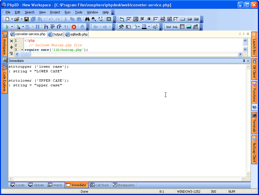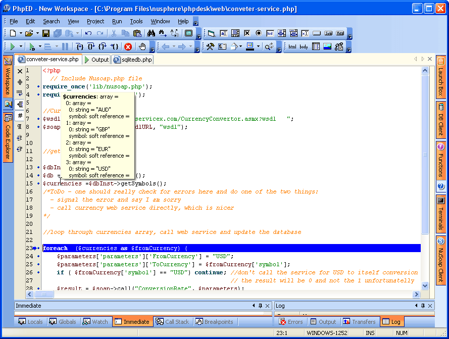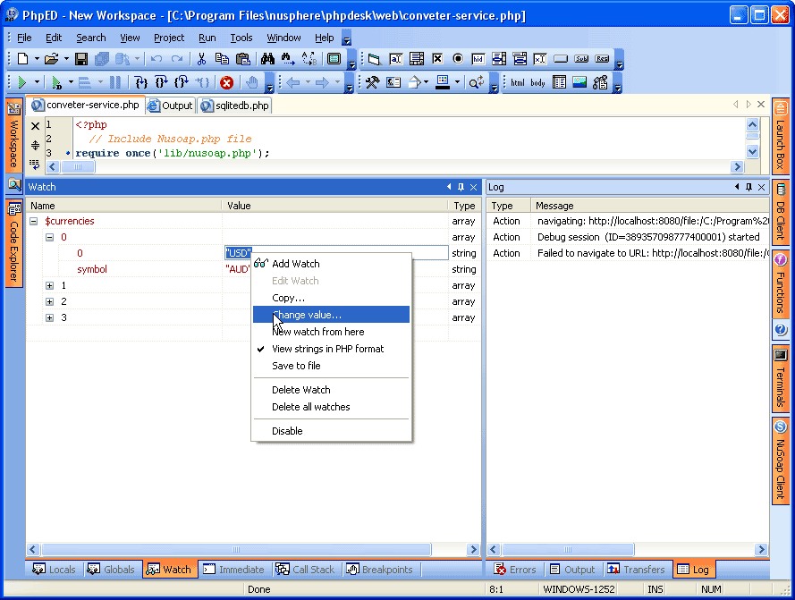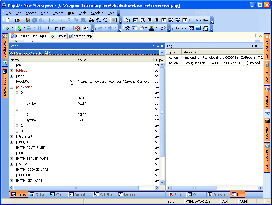 - The values of the Local variables and classes are displayed in Locals tab of PhpED debugger