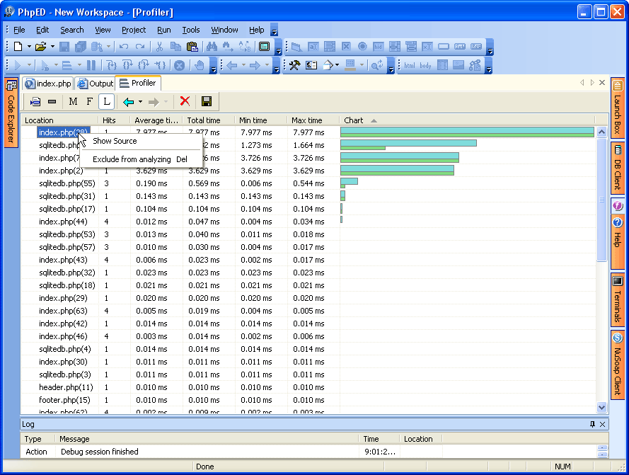 The PhpEd PHP Profiler lets you jump to the location in PHP code directly from the PHP profiler output table. Just double click on the entry in the location column or select the Show Source item from the short-cut menu and PhpED will display the corresponding line of PHP code in the PHP editor. For example, in the illustration below you can see that the line of code which took the longest time to execute according to the Profiler output, is line number 28 in index.php, which took up a total execution time of 7.977 milliseconds.