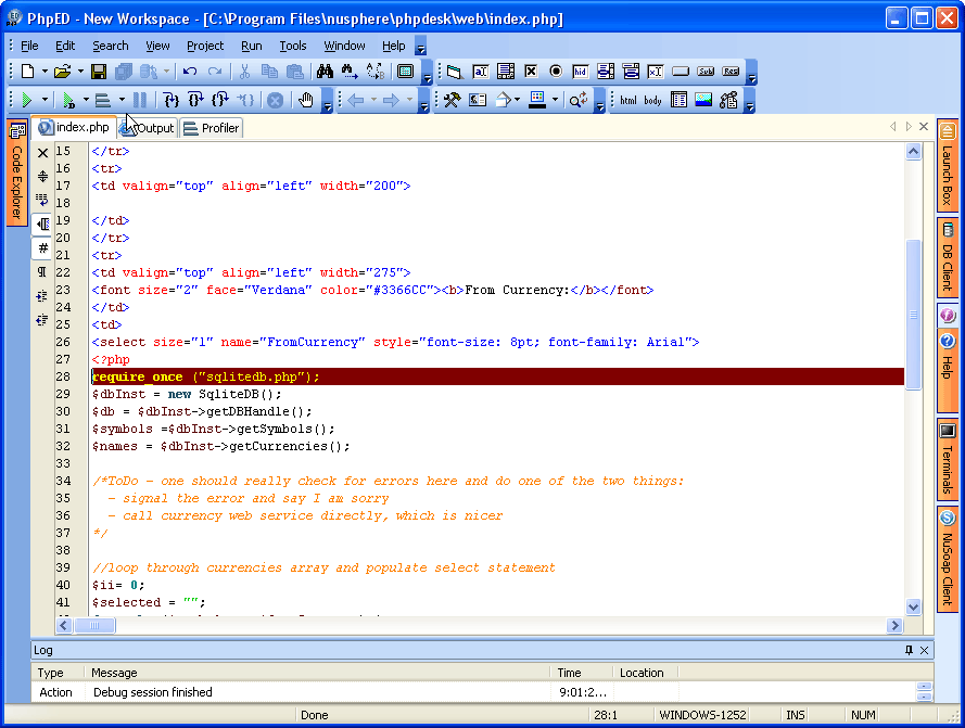 Now when you double-click the index.php entry in the Location column, PhpED will open the index.php in the PHP editor and highlight line #28, as illustrated here: